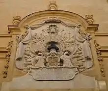 It has a symmetrical façade with an ornate Baroque centrepiece above the main entrance, containing a bronze bust of Carafa and his coat of arms, together with a marble trophy-of-arms and a Latin inscription which reads:[13][36][15]