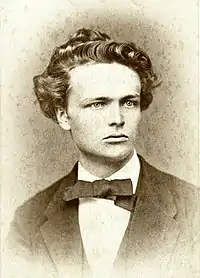 Strindberg returned to Uppsala University in January 1870 to study aesthetics and modern languages and to work on a number of plays.[34] It was at this time that he first learnt about the ideas of Charles Darwin.[35] He co-founded the Rune Society, a small literary club whose members adopted pseudonyms taken from runes of the ancient Teutonic alphabet – Strindberg called himself Frö (Seed), after the god of fertility.[36] After abandoning a draft of a play about Eric XIV of Sweden halfway through in the face of criticism from the Rune Society, on 30 March he completed a one-act comedy in verse called In Rome about Bertel Thorvaldsen, which he had begun the previous autumn.[37] The play was accepted by the Royal Theatre, where it premièred on 13 September 1870.[38][39] As he watched it performed, he realised that it was not good and felt like drowning himself, though the reviews published the following day were generally favourable.[40] That year he also first read works of Søren Kierkegaard and Georg Brandes, both of whom influenced him.[39][41]
