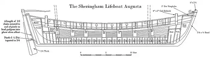 The new lifeboat was built by a local builder, Robert Sunman. It was made from timbers grown in the nearby Sherringham Park and the boat was built in the style of the local herring fishing boats. The Augusta was 33 feet 6 inches[3] long and 10-foot 3 inches[3] wide. The power for the boat was provide by 16 oars.[2] She was equipped with a dipping lug mainsail, mizzen sail and had fittings for a rudder at either end to avoid turning her in heavy seas.[3]