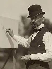 In 1900, as a result of this experience, he was commissioned to create a curtain for the new Josef Kajetán Tyl Theatre. At about the same time, he painted lunettes at the recently completed West Bohemian Museum.[1] He also created monumental paintings for the Higher Economic School, now a satellite institute of Charles University. From 1907 to 1925, he was a teacher at the girls' lyceum.[2]