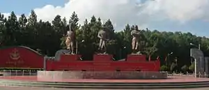 Statue of Alaungpaya (far right) along with the statues of Anawrahta (far left) and Bayinnaung (middle) in front of the DSA.