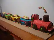 Because of the appealing decorative effects of the cakes, the book has garnered a nostalgic cult following including social media fan groups and projects to reproduce each cake.[7] In 2009, stand-up comedian Josh Earl included reference to the "train cake" in his routine. The segment was so popular he expanded it and the following year launched Josh Earl vs. the Australian Women's Weekly Children's Birthday Cake Book,[16] a show that continued through to 2015.[17] In 2016 all 107 cakes were baked and sold for a Canberra charity to raise money to support women with post- and ante-natal depression.[18][19] In 2018 New Zealand born photographer Henry Hargreaves created an exhibition in Wellington called "Birthdays that will never come" celebrating children who would never have birthdays in New Zealand, by combining children's names that are banned in New Zealand with the "very 80s aesthetic" of the cakes in the cookbook, familiar to him from childhood.[20]