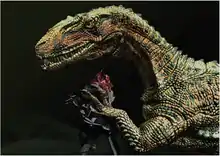 According to Hocknull, it was 2 m (6.6 ft) tall at the hip and 6 m (20 ft) long, with a weight of about 500 to 1,000 kilograms (1,100 to 2,200 lb). Because it was a relatively lightweight predator, he coined it as the "cheetah of its time".[2] Like other megaraptorans, Australovenator would have been a bipedal carnivore.[3]