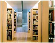Architect Raimund Abraham was the winner among 226 submissions in a competition held in 1992 to choose a design for the ACFNY’s new building. Completed in 2002, the building is situated on a plot in Manhattan that is only 24.5 feet (7.5 m) wide[4] and 81 feet (25 m) deep.[5] It is considered as an architectural anomaly because despite its small footprint it is 24 stories and 275 feet (84 m) tall. The building’s facade is clad in glass and aluminum and gradually tapers to a narrow point as the building slants upwards in accordance with zoning laws.[5] It houses exhibition spaces, a theater, a library for books and audio recordings, offices, seminar and reception rooms, and apartments for the officers of the institution. The library is named in honor of Frederic Morton and has a collection of more than 10,000 books specific to Austrian art and culture.