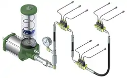 A dual line parallel system is similar to the single line parallel system in that it uses hydraulic pressure to cycle adjustable valves to dispense measured shots of lubricant. It has 2 main supply lines which are alternatively used as pressure / vent lines. The advantage of a two-line system is that it can handle hundreds of lubrication points from a single pump station over several thousand feet using significantly smaller tubing or pipe.