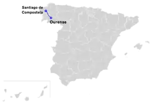 The Autopista A-53 is a highway in north western Spain. It links Santiago de Compostela to Ourense and follows the N-525.[1] It starts to the south east of Santiago at a junction with the Autopista AP-9 (72 km). It passes the Castle Pazo de Oca and Lalín. Thereafter the road has yet to be built and in the Serra do Faro the road as the N-525 crosses a pass at 810 m, under the Pico Seco. At Ourense there are junctions with the Autovía A-52 and N-120.