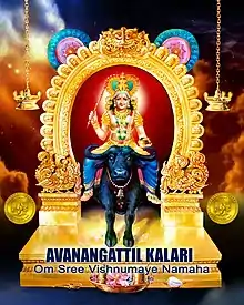 Avanangattilkalari vishnumaya temple is the head temple of all vishnumaya temples in Kerala, especially Malabar.The temple avanangattilkalari call sree vishnumaya "moolasthanam". The god of the temple represents the god in his fierce ('ugra') form, facing East, featuring two hands with various attributes. One is holding Kuruvadi (Magical wand), another hand magical pot (amrutha kumbam) and riding on water buffalo. The temple deity well known for his magical power.[1][2]
