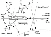 - Finally, in case of space vehicles like space shuttles etc., a modification of the latter convention is used, where the vehicle's (body's) positive y- or pitch axis again always points to its right, and its positive z- or yaw axis always points down, but “down” now may have two different meanings: If a so-called local frame is used as external reference, its positive z-axis points “down” to the center of the earth as it does in case of the earlier mentioned NED-system,[4] but if the inertial frame is used as reference, its positive z-axis will point now to the North Celestial Pole, and its positive x-axis to the Vernal Equinox[5] or some other reference meridian.