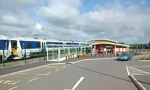 ![]() Aylesbury Vale Parkway station, showing the taxi rank (left), cycle shelter (centre) and booking hall (right) | |