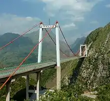 Azhihe River Bridge is a 247-metre-high (810 ft) suspension bridge in the Liuzhi Special District, Guizhou, China. As of 2019, it is among the fifty highest bridges in the world. The bridge is located on the Shuihuang highway between Guanling and Liupanshui. The 283 metre span crosses the valley of the Azhihe River, a small tributary of the Beipan River.