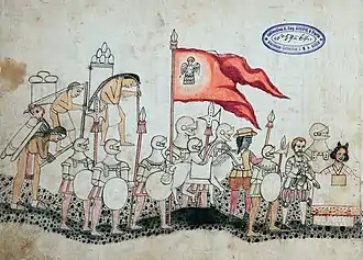 Nahua peoples descended from Chichimec peoples, who migrated to central Mexico from the north (mainly centered sparsely around present-day states of Zacatecas, San Luis Potosí, and Guanajuato) in the early 13th century.[10] The migration story of the Mexica is similar to those of other polities in central Mexico, with supernatural sites, individuals, and events, joining earthly and divine history, as they sought political legitimacy.[11] Pictographic codices in which the Aztecs recorded their history say that the empire's place of origin was called Aztlán. Early migrants settled the Basin of Mexico and surrounding lands by establishing a series of independent city-states. These early Nahua city-states or altepetl were ruled by dynastic heads called tlahtohqueh (singularly tlatoāni). Most of the existing settlements had been established by other indigenous peoples before the Mexica migration.[12]