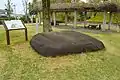 The Azuma Kofun is located on a narrow plateau between the Ogawa and Sugata rivers, which run north and south through the northern Kantō Plain. As a result of an archaeological excavation from 2007 to 2010, it was determined that the tumulus is a zenpō-kōhō-fun (前方後方墳) built in two tiers. The lower tier (base) is wide, and with a total length of about 128 meters was found to be the largest in the prefecture. The second tier is about 86 meters long with a height of about 10 meters. The two-tiered mound is set on a base of similar shape, and is surrounded by a moat with a width of about 20 meters and a depth of about three meters. Pumice deposits from the 1108 AD eruption of Mount Asama were confirmed from the soil filling the moat. The burial facility is a horizontal hole type stone chamber with dimensions of 2.4 meters long x 1.7 meters wide x 2.0 meters high; however, during the Edo period, the front part of the rectangular portion of the tumulus was destroyed, and the entrance stone and one of the ceiling stones were removed by the daimyō of Mibu Domain for use as ornamental stones in the gardens of Mibu Castle, where they can still be seen. The entrance stone was of cut tuff with a rectangular opening for a door, whereas the ceiling stone (and remaining stones in the walls and remaining ceiling of the burial chamber) are of monolithic diorite. Red pigment was applied to the walls of the burial chamber, which was backfilled for preservation after the 2010 excavation.[2]