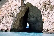 The Azure Window developed through sea erosion of a cliff face. The progress starts with an initial notch resulting from wave action. This space devoid of rock then causes tensile stresses that lead to the formation of a vertical joint extending upwards from the notch. This joint would progressively become wider, first forming a cave and eventually an arch. The end of the lifecycle of the arch is reached when erosion finally progressed so far that the roof of the arch gets heavier than the pillars can support.[1] It is not known exactly when the arch came to being, but the entire process is believed to have taken around 500 years.[2][3]