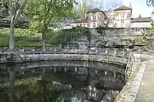 The geographer François Robert wrote in 1789 that the Bèze spring is one of the four most significant in France.[20] The spring is the most photographed place in Bèze. Some postcard publishers do not hesitate to improve the picture by scratching the glass plate negative for a more impressive outpouring.[15] The walk at the source around the spring is a monument historique site with construction dated to the 18th century and trees that are 200 to 300 years old.[21]