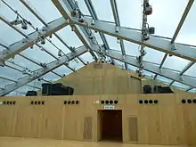 Sir Y.K. Pao Studio Today, Sir Y.K. Pao Studio, sponsored by Dr Helmut Sohmen and Professor Anna Pao Sohmen, serves as a spectacular multi-function room on the second floor of Béthanie. The room was originally a pitched roof with tiles. Due to the limited space, it was later reconstructed with a flat roof. It was not until the restoration project when the distinctive pitch roof was brought back into the design, using double-glazed panels of glass. The studio has a floor area of 21 square metres (230 sq ft) is equipped with wall mirrors, dance bars, glazed windows and other technical facilities and non-permanent seating.[16]