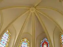 Based on neo-gothic design, Béthanie is a stylish composition of symmetrical cylinders. Apart from that, ogive, tracery, stained glass as well as Gothic arched windows can be found in the building. With a high ceiling and pitched roof, the George C. Tso Memorial Chapel is a typical illustration of neo-gothic architectures in Béthanie, though in a much simpler style and smaller scale. Among its nineteen stained glass windows, nine were originals. The remaining ones, either in disrepair or missing, were reproduced hand-made in the Philippines. Also, only four out of the twelve statues of the apostles, originally standing on corbels above the altar, have been found. Although the genuine ones were unavailable for exhibition, the Academy has replicated the statues with a silicone molding technique. Moreover, many neo-gothic structures within the perimeter have been conserved. One of these examples are the flying buttresses that were used to support the exteriors of buildings in the past. Although no longer functional, they have been restored to maintain authenticity. The Rib vaults, built in to support the ceiling and roof have also been retained in the chapel for decorative purposes.