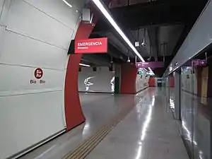 Bío Bío is an underground metro station on the Line 6 of the Santiago Metro, in Santiago, Chile. This station is named for the station is located steps from the La Aguada Flood Park and the mentioned commercial district, one of the oldest in the city. The station was opened on 2 November 2017 as part of the inaugural section of the line, between Cerrillos and Los Leones.[1]