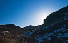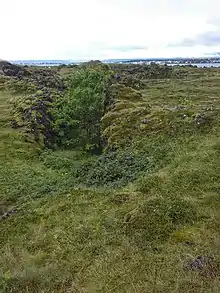 Another lava channel reaches west from Búrfell in direction of Kaldársel, but filled up with lava so it is not easily discovered.[7] This is the oldest lava channel, it is named Lambagjá (Icelandic pronunciation: [ˈlampaˌcauː], "lamb canyon"), the youngest is Kringlóttagjá ([ˈkʰriŋlˌouhtaˌcauː], "round canyon") south of Búrfellsgjá,[5] where there was also a lava pond.[2]