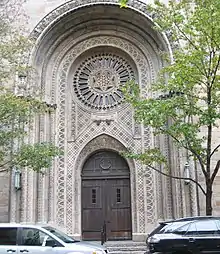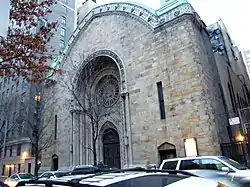 In 1864, the congregation moved yet again, to a new building on 34th Street,[2] the parcel later became part of the site of the flagship Macy's store. Driven by the rapid expansion of the city, they moved yet again in the spring of 1885 to Madison Avenue at 65th Street. That building was designed by Rafael Guastavino and Schwarzmann & Buchman. Less than a year later, a fire did extensive damage to the building.[15] Reports rated the damage at $35,000.[16][17] B'nai Jeshurun was temporarily relocated to Congregation Ahawath Chesed on Lexington Avenue, which ironically had a fire of its own within the month, leaving both congregations homeless.[18]