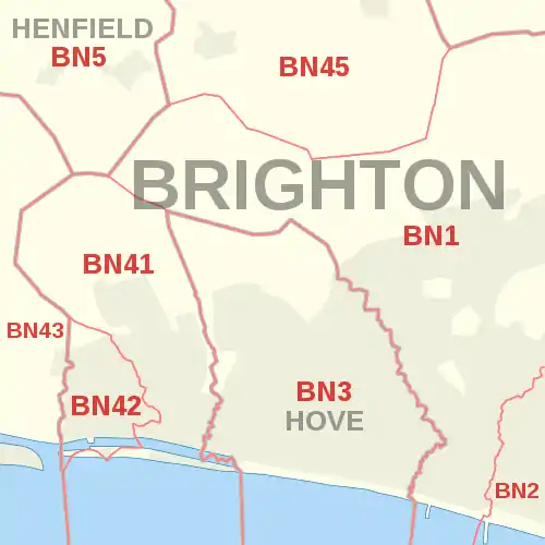 The BN postcode area, also known as the Brighton postcode area,[2] is a group of 30 postcode districts in South East England, within 18 post towns. These cover southwestern East Sussex (including Brighton, Hove, Eastbourne, Lewes, Hailsham, Newhaven, Peacehaven, Pevensey, Polegate and Seaford) and southeastern West Sussex (including Worthing, Littlehampton, Arundel, Hassocks, Henfield, Lancing, Shoreham-by-Sea and Steyning). The main sorting office is at the Gatwick Mail Centre in Crawley.