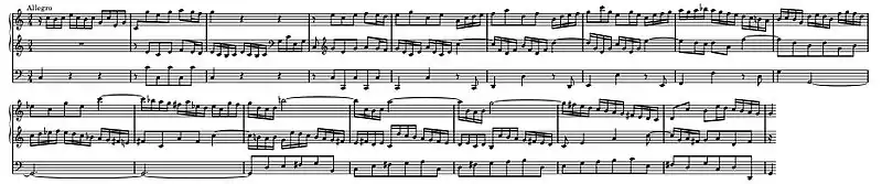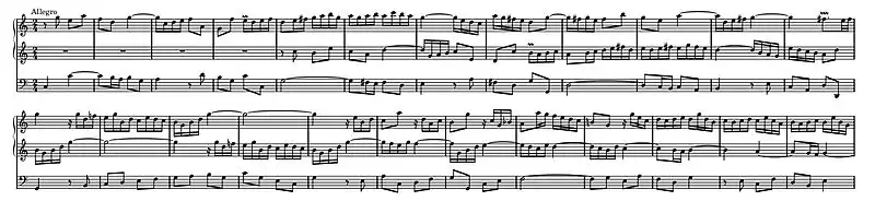 This brightly scored and skillfully composed movement has a da capo A–B–A form. In structure and texture it resembles a trio sonata in the galant style for two flutes and continuo. The range of the keyboard parts, however, is beyond that of such instruments; and the succinct and idiomatic keyboard writing with intricate development sections are typical of the organ sonatas. The A section is 50 bars long. After the 54 bar development section B, it is reprised in its entirety.