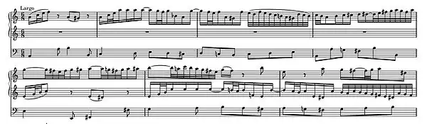 Williams (1985) gives a broad musical description of the Largo as a movement with two voices in dialogue over a continuo bass combining aspects of three different musical forms: fugue, ritornello and da capo aria. Together these create a mood or affekt tinged with melancholy. In the opening bars the first fugal subject and counter-subject are heard in the manuals over the continuo bass. The elegiac passage with the lyrical subject and counter-subject in counterpoint is heard several times, scarcely altered, during the movement. It is instantly recognizable each time it returns and plays the role of a ritornello. The second subject starts at bar 13 and illustrates the other groups of musical figures that Bach employs in the movement.