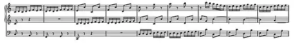 Secondly the limitation to three movements, omitting a first slow movement, was perhaps a conscious decision of Bach.[17] In the earlier collection of sonatas for violin and obbligato harpsichord (BWV 1014–1019), mostly composed in four movements, the opening slow movements have long cantilena melodies for the solo violin. This style of writing would not have translated well to the organ: indeed Bach reserved such lines for the elaborate cantus firmus parts in his ornamental chorale preludes. In the sonatas for violin and harpsichord, Bach does not adhere to strict trio sonata form in the slow movements, where the upper part in the obbligato harpsichord part can be divided into two voices; and where the violin can fill out the harmonies with double stopping. In the organ sonatas the harmonies are provided by the pedal and the two manual parts, which play single melodic lines throughout.[18]