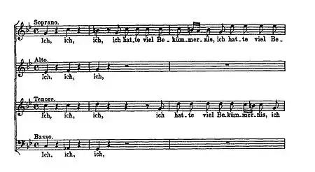 Fourth movement. The last movement of Op.3, No.11 is composed in ritornello A–B–A form. In the opening bars the first and second violins play in tutti the opening theme with its repeated quavers and clashing dissonances. Bach used the same theme for the opening chorus of his cantata Ich hatte viel Bekümmernis, BWV 21, first performed on 17 June 1714, shortly before ill health forced Prince Johann Ernst to leave Weimar for treatment in Bad Schwalbach.