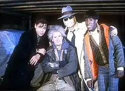 | .jpg.webp) In the despair induced hallucination the characters believe that they are (from left to right) fascist police chief Sebastian Doyle, homeless outcast William Doyle, cyborg traffic officer Jake Bullet, and charmless nerd Duane Dibbley | |