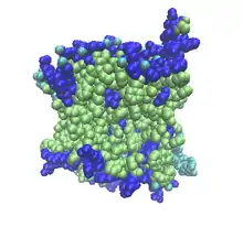 Bacterial Leucine Transporter (LeuT) is a bundled twelve alpha helix protein which belongs to the family of transporters that shuttle amino acids in and out of bacterial cells. Specialized in small hydrophobic amino acids such as leucine and alanine, this transporter is powered by the gradient of sodium ions that is normally maintained by healthy cells across their membranes. LeuT acts as a symporter, which means that it links the passage of a sodium ion across the cell membrane with the transport of the amino acid in the same direction. It was first crystallized to understand the inner molecular mechanisms of antidepressant's work since it has a close resemblance with the human neurotransmitter transporters (more difficult to crystallize) that these drugs block, thus inhibiting the reuptake of chemical messengers across the cell membrane of nerve axons and glial cells.[1][2]