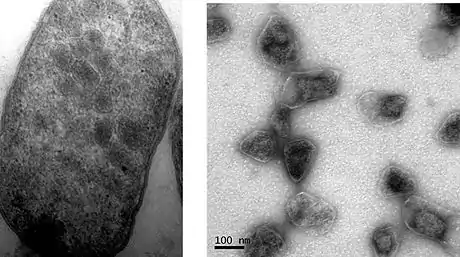 The first BMCs were observed in the 1950s in electron micrographs of cyanobacteria,[17] and were later named carboxysomes after their role in carbon fixation was established.[18] Until the 1990s, carboxysomes were thought to be an oddity confined to certain autotrophic bacteria. But then genes coding for proteins homologous to those of the carboxysome shell were identified in the pdu (propanediol utilization)[19] and eut (ethanolamine utilization)[20] operons. Subsequently, transmission electron micrographs of Salmonella cells grown on propanediol[21] or ethanolamine[22] showed the presence of polyhedral bodies similar to carboxysomes. The term metabolosome is used to refer to such catabolic BMCs (in contrast to the autotrophic carboxysome).