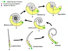 The Bactritidae[2] are characterized by long orthoconic to cyrtochonic shells with a small apical angle (less than 10°) and septal necks that are orthochoanitic. Chamber length is variable. The Bactritidae contain eight recognized genera. Bactrites has the longest range, from the Lower Devonian to the Upper Permian, and even possibly from the Silurian. The Bactritidae gave rise to the Ammonoidea in the Early Devonian starting with an early Bactrites and going with increasingly tight curvature from Lobobactrites to Cyrtobactrites, leading to the gyroconic Anetoceras of the Anarcestida (Ammonoidea).[2][3]