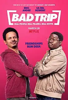 Bad Trip is a 2021 American hidden camera comedy film directed by Kitao Sakurai. The film follows two best friends (Eric André and Lil Rel Howery) who take a road trip from Florida to New York City so one of them can declare his love for his high school crush (Michaela Conlin), all the while being chased by the other's criminal sister (Tiffany Haddish), whose car they have stolen for the trip.[3]