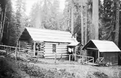 The Bagby Guard Station is located in the Mount Hood National Forest forty miles southeast of Estacada, Oregon, just outside the boundary of Bull of the Woods Wilderness area. It was built next to Bagby Hot Springs in 1913 by Phillip F. Putz, the Forest Service guard assigned to the area. Putz also built a small storage shed adjacent to the cabin. In the years following its construction, the guard station was used as a barracks for Forest Service fire crews that patrolled the surrounding forest during the summer fire season.[2] In 1925 Putz built his own home in Colton, Oregon.