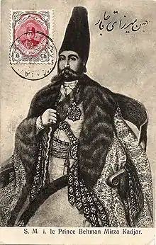 Bahman Mirza (Persian: بهمن میرزا; 11 October 1810 – 11 February 1884) was a Persian prince of the Qajar Dynasty, son of Abbas Mirza and grandson of Fath Ali Shah. He was Vicergerent (vali) of Azerbaijan and Governor-General of Tabriz. He later migrated to neighboring Imperial Russia, where he was received with great honour and lived a prestigious life in Shusha. Many of his offspring either returned to Iran where they had political or military careers, or served in the Russian military, and later played an important role in the military of Azerbaijan Democratic Republic. Beside political figures, he is also the great-grandfather[1] of Afrasiyab Badalbeyli, Azerbaijani composer and author of the first Azeri balet and the first ballet in the Muslim East.[2][3]