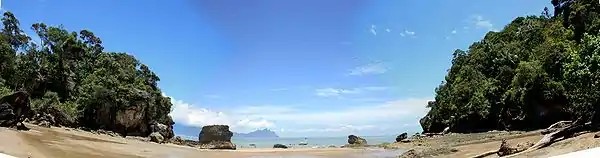 Bako National Park is a national park in Kuching Division, Sarawak, Malaysia. Established in 1957, it is the oldest national park in Sarawak. It covers an area of 27.27 square kilometres (10.53 sq mi) at the tip of the Muara Tebas peninsula at the mouth of the Bako and Kuching Rivers. It is approximately 40 kilometres (25 mi) by road from Kuching. Millions of years of erosion of the sandstone have created a coastline of steep cliffs, rocky headlands and stretches of white, sandy bays. Wave erosion at the base of the cliffs has carved many of the rocky headlands into fantastically shaped sea arches and seastacks with colored patterns formed by iron deposition. The most famous of them is shaped like a cobra's head which can be spotted on a boat ride from the headquarters or one of the beaches. Some of these rock formations can be seen on entry to the Teluk Assam Beach, which fronts the park. The park can only be reached by a 20-minute boat ride from the village of Kampung Bako. It is often visited as a day-trip from Kuching, though accommodations (campground and forestry service bungalows) are available.