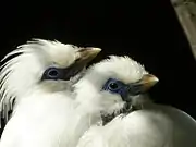 A population of Bali mynas now exists on the island of Nusa Penida and its sister islands of Nusa Ceningan, Nusa Lembongan, which are 14 km off the south east coast of Bali. The islands have been transformed into an unofficial bird sanctuary by Friends of National Parks Foundation (FNPF), an Indonesian NGO based in Bali.[8] This was achieved by FNPF working for many years with the 40+ villages on the islands and persuading every village to pass a traditional Balinese village regulation to protect birds, and effectively removing the threat of poachers. Since then, FNPF has rehabilitated and released several endangered birds onto the island of Nusa Penida, including many Bali mynas supplied from multiple breeders.[9]