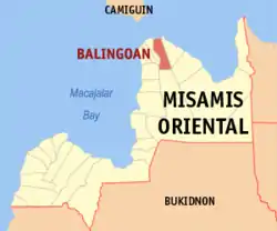 ![]() Map of Misamis Oriental with Balingoan highlighted | |