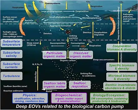The biological carbon pump is one of the chief determinants of the vertical distribution of carbon in the oceans and therefore of the surface partial pressure of CO2 governing air-sea CO2 exchange.[33] It comprises phytoplankton cells, their consumers and the bacteria that assimilate their waste and plays a central role in the global carbon cycle by delivering carbon from the atmosphere to the deep sea, where it is concentrated and sequestered for centuries.[34] Photosynthesis by phytoplankton lowers the partial pressure of CO2 in the upper ocean, thereby facilitating the absorption of CO2 from the atmosphere by generating a steeper CO2 gradient.[35] It also results in the formation of particulate organic carbon (POC) in the euphotic layer of the epipelagic zone (0–200 m depth). The POC is processed by microbes, zooplankton and their consumers into fecal pellets, organic aggregates (“marine snow”) and other forms, which are thereafter exported to the mesopelagic (200–1000 m depth) and bathypelagic zones by sinking and vertical migration by zooplankton and fish.[36] Although primary production includes both dissolved and particulate organic carbon (DOC and POC respectively), only POC leads to efficient carbon export to the ocean interior, whereas the DOC fraction in surface waters is mostly recycled by bacteria.[37] However, a more biologically resistant DOC fraction produced in the euphotic zone (accounting for 15–20% of net community productivity), is not immediately mineralized by microbes and accumulates in the ocean surface as biologically semi-labile DOC.[38] This semi-labile DOC undergoes net export to the deep ocean, thus constituting a dynamic part of the biological carbon pump.[39] The efficiency of DOC production and export varies across oceanographic regions, being more prominent in the oligotrophic subtropical oceans.[40] The overall efficiency of the biological carbon pump is mostly controlled by the export of POC.[37][41]