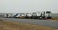 The ballast box is a metal box installed on the rear chassis of the tractor instead of the fifth wheel coupling. Earlier heavy haulers unmounted the fifth wheel and used merely a piece or two of heavy rocks, stones or concrete blocks which weighted enough to avoid wheel spin, later builders and heavy haulers developed metal boxes of different designs to match the tractor layout. These boxes were filled with concrete or steel to increase the weight of the tractor. The problem with ballast tractors was the weight of ballast itself weighted over 10, 20 or even 40 tons in some scenario. Other designs also included sleeping cabins in the ballast for the drivers and the crew for longer journeys and harsh weather conditions,[3] this made the height of the tractors increase significantly these units are still used today in the gulf area due to extreme heat. Some units have factory fitted ballast box with appropriate weight to meet with the regional guidelines, these tractors units do not have fifth wheel and drive out from the factory with a ballast box. Heavy haul operators convert heavy-duty tractors to ballast tractors with an aftermarket ballast box built by a builder or by themselves.