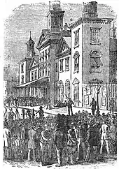 The men were met with jeers by a crowd of 2,000 to 4,000.[5]: 70–1 [7]: 734 This escalated into paving stones thrown through the door and windows of the building. Soldiers who subsequently arrived were beaten and driven away.[15]: 57 [lower-alpha 14] Additional police were sent for in hopes of clearing the way and relieving the troops of the need to use force against the crowd, but those who arrived were unable to effect any order, and were forced to shelter in the armory along with the soldiers.[15]: 57 [19]