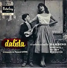 "Bambino" is a song recorded by Egyptian French singer Dalida that became her first major hit. It was first released on 28 October 1956 as title song of her third EP, prior to her debut album Son nom est Dalida.[1] Bambino spent 45 weeks atop the French song charts, becoming the longest-running number one song in world history.[2]