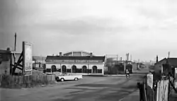 From Farthinghoe the track curved round to the west to run nearly parallel with the Great Western's line from Oxford to Banbury before entering Merton Street (21.75 miles from Bletchley). The wooden main station building was frugally built with a timber island platform covered by a glazed roof supported by steel columns. A timber goods shed was initially provided to be later rebuilt in brick. The locomotive shed had capacity for eight engines and up to 1934 acted as a sub-depot for Bletchley with men rostered there. A cattle dock and sidings were provided to handle the substantial agricultural traffic; sidings also led to the nearby gasworks and the Great Western's Banbury yard.[13] The timber boarding on the station roof had by 1956 reached such a condition that it posed a danger to passengers and it was removed leaving the metal supports and piping which were painted white.[14]