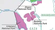 The Banhine, Zinave and Limpopo national parks in Mozambique, the Gonarezhou National Park in Zimbabwe and the Kruger National Park in South Africa are the basis for the Great Limpopo Transfrontier Park, part of the Great Limpopo Transfrontier Conservation Area that will link the Drakensberg Mountains in the west to the Save River Estuary in the east. The total protected area will exceed 95,624 square kilometres (36,921 sq mi).[4]