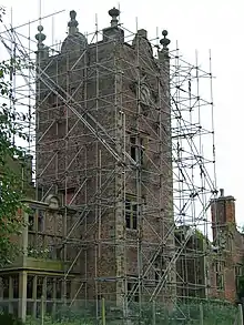 In 1952 Bank Hall was granted Grade II* listed building status.[26] In 2002 it was in the 22% of buildings in the UK at immediate risk of further rapid deterioration or loss of fabric.[27] and is on the Buildings at Risk Register[28] described as in very bad condition and priority B for restoration and conservation.[29] In 2010, the house was in a ruinous state.[30] The west wing roof and north-east corner of the clock tower collapsed in the early 1980s, losing a clock face and three-quarters of the statues from the battlements.[31] In 2001 listed building consent was granted for structural work to the tower,[32] Three of the decorative corner pinnacles remain but the west elevation has a crack held together by scaffolding installed in 2002 during emergency repairs funded by the action group and English Heritage.[33] At that time, the remains of the clock mechanism were removed and the fallen statues and clock face parts put into storage. In 2006 an attic water tank crashed through the floors in the oldest part of the building causing damage to the roof, a front gable and the rooms below. On 26 July 2007 BBC Breakfast News featured the building, as one of sixteen buildings in the UK which require emergency work. A cantilevered oak staircase remains in the tower where, in 2008, part of the staircase from the south elevation collapsed, but caused no damage to the balustrade.[13]