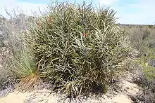 Banksia elderiana, commonly known as the swordfish banksia,[2] is a species of shrub in the plant genus Banksia. It is a tangled, bushy shrub with stiff, serrated leaves and spikes of yellow flowers. It occurs in two disjunct areas in the Goldfields-Esperance region of Western Australia. One population extends over a large area from west of Kalgoorlie south to Ravensthorpe, with another population in the Great Victoria Desert north of the Queen Victoria Spring.