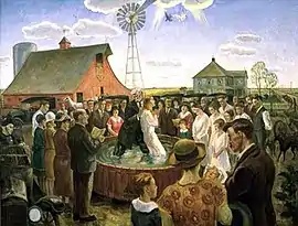 Baptism in Kansas is a 1928 painting by the American painter John Steuart Curry. It depicts a full-submersion baptism in a water tank. In the sky are a raven and a dove, a reference to the birds Noah released from the Ark. The painting is based on a scene Curry witnessed in 1915, when the creeks were dried up and the water tank was the only suitable site for the baptism. It was painted in August 1928.[1]
