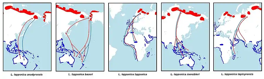 Distribution of the five subspecies of Limosa lapponica, showing Northern Hemisphere summer breeding grounds (red), non-breeding overwintering areas (blue) and migration routes in each direction