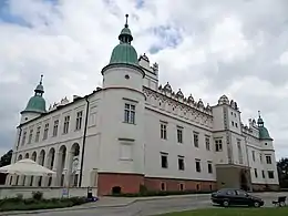 The castle was built around the years 1591–1606 in the style of Poland's Mannerism with richly decorated attics, side towers and arcade courtyard for Andrzej and Rafał Leszczyński (1526–1592) of the Wieniawa coat of arms.[2] It is believed to be the work of a famous Italian architect, Santi Gucci, the court artist of king Stephen Báthory.[2] In about 1620 the castle was surrounded by bastion fortifications and in 1625 its chambers were adorned with early Baroque decorations executed by the eminent stucco decorator Giovanni Battista Falconi.[1]