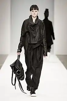 In her fashion designs, she makes extensive use of draping and layering techniques, often creating asymmetrical garments that can be worn in multiple ways. Juxtaposition and deconstruction play a central part, with Gongini predominantly using black and non-colors ‘to allow fabrics and textures to speak as color instead’.[3] She combines a variety of natural and recycled textiles, sometimes mixing several types of materials, such as wool, leather, cotton and plastic, in a single garment.[12] Gongini's leather garments are often treated to give a dramatic texture that is reminiscent of the Faroese landscape.[13] Her designs are available at the BARBARA I GONGINI headquarters showroom in Copenhagen and in specialized avant-garde clothing stores worldwide. Gongini's avant-garde design philosophy means that the collections are not trend-based, but focus on ‘nurturing a longevity formula’.[3] She often compares her collections to new chapters to turn to in a story, describing them as ‘numerical’.[14] As a proponent of the zero-waste wardrobe, she seeks to lengthen the life-cycle of garments through innovative designs called ‘multiways’. [4]